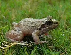 Adult males measure 19–29 mm (0.7–1.1 in) and adult females 24–36 mm (0.9–1.4 in) in snout–vent length.[4] The tympanum is two-thirds of the eye diameter; a strong supra-tympanic fold runs from the eye to the shoulder. The fingers and toes bear enlarged discs; the toes are two-thirds webbed. Dorsal skin is rough with number of folds. Colouration is brownish with many, closely set black spots. The limbs are cross-barred. The venter is white while the throat is finely mottled with brown.[7]