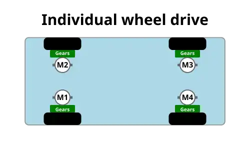 Individual-wheel drive (IWD) is an automobile design in which the vehicle has an all-wheel drive powertrain that consists of multiple independent traction motors each supplying torque to a single drive wheel.[1] The term was coined to identify electric vehicles with a four-motor layout, where each wheel is driven by an individual electric motor,[2][3] as opposed to the differential drivetrain seen in conventional four wheel drive (4WD) ICE vehicles and the dual-motor 4WD design seen in many plug-in electric vehicles.