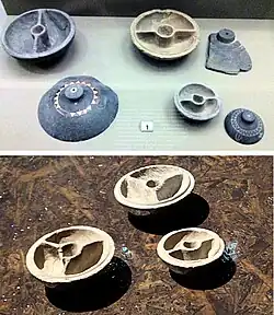 Stone palette, also called "toilet tray" or "cosmetic trays") is a round tray commonly found in the areas of Bactria and Gandhara, and which usually represent Greek mythological scenes. Some of them are attributed to the Indo-Greek period in the 2nd and 1st century BCE. A few were retrieved from the Indo-Greek stratum No.5 at Sirkap. Some stone palettes with some very pure Hellenistic designs are thought to date to circa 100 BCE, and to have come from Taxila.[46] Other have mythological themes, such as the Rape of Europa, which "could have only been made by a Greek patron during the Indo-Greek period".[47]