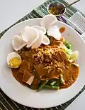 Bumbu kacang or peanut sauce represents a sophisticated, earthy seasoning rather than a sweet, gloppy sauce.[41] It should have a delicate balance of savoury, sweet, sour, and spicy flavours, acquired from various ingredients, such as fried peanuts, gula jawa (coconut sugar), garlic, shallots, ginger, tamarind, lemon juice, lemongrass, salt, chilli, peppercorns, sweet soy sauce, ground together and mixed with water to form the right consistency. The secret to good peanut sauce is "not too thick and not too watery". Indonesian peanut sauce tends to be less sweet than the Thai version, which is a hybrid adaptation. Gado-gado is a popular dish particularly associated with bumbu kacang, and is eaten across Indonesia.