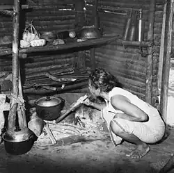 Indonesian traditional meals usually consists of steamed rice as staple, surrounded by vegetables and soup and meat or fish side dishes. In a typical family meal, the family members gather around the table filled with steamed rice and several other dishes.[1] Each dish is placed in a large communal plate or in bowls. Each of these dishes has its own serving spoons, used only to move food from the communal plate to one's personal plate. Each of the family members has their own personal plate that is first filled with steamed rice. Usually the oldest family member or the husband has the right to initiate the meal,[24] followed by the rest of the family to help themselves with the dishes. Each of them take some portion of dishes from the communal plates into their own individual plates.