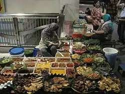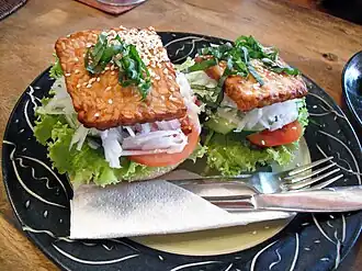 Vegetarianism is well represented in Indonesia, as a wide selection of vegetarian dishes and meat substitutes are served. According to a Euromonitor International survey conducted in 2018, Indonesia has the third-highest rate of vegetarianism growth.[29] Dishes such as gado-gado, karedok, ketoprak, tauge goreng, pecel, urap, rujak and asinan are vegetarian dishes. However, dishes that use peanut sauce, such as gado-gado, karedok or ketoprak, might contain small amounts of shrimp paste, called "terasi". Shrimp paste is also often used to add flavour to spicy sambal chili paste served with lalap, assorted fresh vegetables. Fermented soy products, such as tempeh, "tahu" (tofu) and oncom are prevalent as meat substitutes and as a source of vegetable protein. In contemporary fusion cuisine, tempeh is used to replace meat patties and served as tempeh burgers.[30]