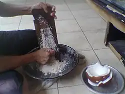 After the milk has been extracted from the shredded coconut flesh to make coconut milk, the ampas kelapa (leftover coconut flesh) can still be used in urap, seasoned and spiced shredded coconut meat mixed together with vegetables. Leftover shredded coconut can also be cooked, sauteed and seasoned to make serundeng, almost powdery sweet and spicy finely shredded coconut. Kerisik paste, added to thicken rendang, is another use of coconut flesh. To acquire a rich taste, some households insist on using freshly shredded coconut, instead of leftover, for urap and serundeng. Serundeng can be mixed with meat in dishes such as serundeng daging (beef serundeng) or sprinkled on top of other dishes such as soto or ketan (sticky rice). An example of the heavy use of coconut is burasa from Makassar, rice wrapped in banana leaf cooked with coconut milk and sprinkled with powdered coconut similar to serundeng.