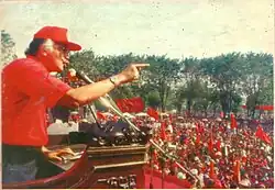 Under the leadership of Wahono, who had been elected chairman of Golkar in the 1988 Golkar National Conference,[9] Golkar's largest challenge ahead of the 1992 elections, was in retaining its large 73.11% victory it had received in 1987. Its biggest threat to accomplishing this goal was the PDI, under the leadership of Suryadi, which had begun to increasingly use the symbols of former president Sukarno to gain support.[10] Golkar's 1992 campaign began with a kick-off rally in Surabaya, East Java, to excite and get out the vote for Golkar. During the campaign, Golkar mainly campaigned on stability and the economy, with party spokesman and former party vice chairman Sarwono Kusumaatmadja arguing that it was difficult to bring about change without risking the unity of the nation, and that the priority of the nation should be to build a strong economic basis.[11]
