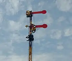 The Krian signal is moved using a lever installed near the station's PPKA room, causing the tebeng to move and The driver will follow the aspect indicated by the tebeng-tebeng. Krian signals can have two or three aspects. In the two-aspect krian signal, the "stop" aspect is indicated by a red board that can be seen by the driver, while the "go" or "walk carefully" aspect is indicated by a red board that is moved 90 degrees so that it is not visible to the driver.[10] Meanwhile, in the three-aspect krian signal, the "stop" aspect is indicated by a red board that can be seen by the driver, the "walk carefully" aspect is indicated by an invisible red board, with an upright arm, and the "walk" aspect is indicated by an arm that looks diagonal.