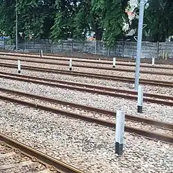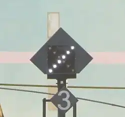 | The Semboyan 9J is a permanent signal in the form of a number on a square board which indicates that the train will enter the designated track number. | |
