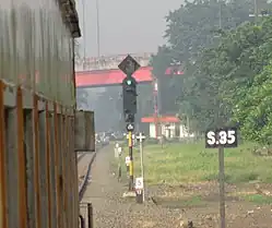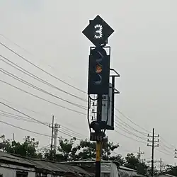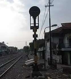 The Tebeng signaling device was the first railway signaling equipment used on Staatsspoorwegen lines since it first operated in 1878. The Krian signaling device (Dutch: Krianinrichting) was a development of the Tebeng signal, which used a tall tower equipped with locking equipment. The name of this signaling equipment is attributed to Krian Station, a railway station in Sidoarjo Regency, which was also the first station to use the signaling.[5] The last railway line to use the Krian signal was the Kalisat–Panarukan railway line, which was closed in 2004.[6] It is recorded that the Krian signal has been preserved at Krian Station, Tamanan Station,[7][6] Ambarawa Railway Museum,[8][9] and Garut Station.[10]
