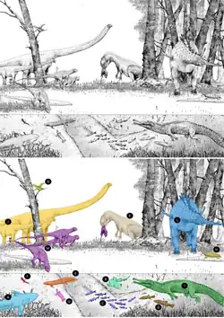 While the environment is well understood, the age of the Phu Kradung Formation is not as well known due to the lack of marine foraminifera or volcanic ash that could help in dating. To this come two contradictory hypothesis based on different methods. On the one hand, the general fauna of the formation better matches the Late Jurassic while dating using zircons and palynological data both point towards the Early Cretaceous. Another hypothesis combines the two, suggesting that the formation straddles the Jurassic-Cretaceous boundary, putting the Phu Noi locality and therefore Indosinosuchus into Tithonian strata. This would be congruent with the hypothesis that freshwater teleosaurs, which were dominant in the lower parts of the formation were replaced by goniopholids and pholidosaurids such as Chalawan thailandicus during the Cretaceous.[1][6]