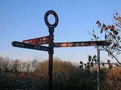 Ladyha No 2 pit was sunk in 1885 to a depth of 568 feet (173 m) and closed in May 1934, having struggled since its main customer, the Eglinton Iron Company, closed in 1928. A fairly substantial brick-lined tunnel still survives which once carried a standard gauge railway line unobtrusively to Ladyha colliery, out of the Earl's sight and the smoke kept away from the kitchen gardens' greenhouses and plants.[38] Other such cosmetic tunnels exist at Alloway and near Culzean Castle.[39] The tunnel was used during World War II as a bomb shelter and storage area for furniture; it remains in good condition. The old colliery ruins were razed to the ground in 2011, having been assessed as a danger to the public.