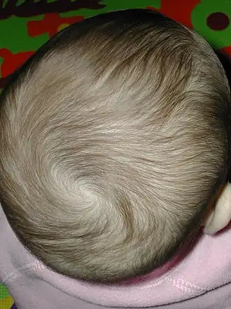 Some newborns have a fine, downy body hair called lanugo. It may be particularly noticeable on the back, shoulders, forehead, ears and face of premature infants. Lanugo disappears within a few weeks. Infants may be born with full heads of hair; others, particularly Caucasian infants, may have very fine hair or may even be bald. Amongst fair-skinned parents, this fine hair may be blonde, even if the parents are not. An infant's hair color and texture can change: red can give way to blond, curly can go straight, and thick, dark hair could reappear a lot sparser and lighter. The scalp may also be temporarily bruised or swollen, especially in hairless newborns, and the area around the eyes may be puffy.