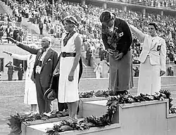 At the Olympic Games, aged 12, she won a bronze medal in the 200m breaststroke.[6][n 1] She is the youngest medal winner at the Olympic Games in an individual competition.[7] Her final on 11 August was the first event to be broadcast live on air by Danish radio, which itself was a sensation.[8] During the games she got the nickname Lille henrivende Inge (Little Lovely Inge).[9]