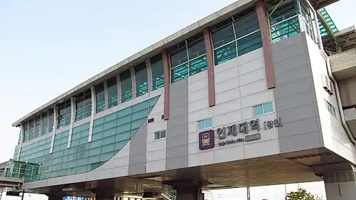 Inje University Station (Korean: 인제대역; Hanja: 仁濟大驛) is a station of the BGLRT Line of Busan Metro in Samjeong-dong, Gimhae, South Korea.