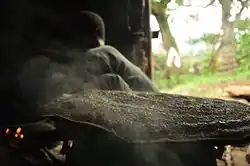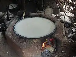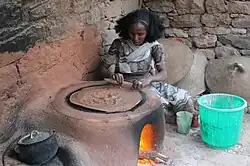 Traditional clay stoves can be inefficient in that they consume large amounts of firewood and produce a lot of smoke, creating household pollution and making them dangerous to use around children.[11] In 2003, an Eritrean research group designed a stove for cooking injera and other foods that uses more easily available fuel, such as twigs instead of large branches, crop residues and dung, locally called kubet.[12] Several parts of this new stove are made in the central cities of Ethiopia and Eritrea, while other parts are moulded from clay by women in local areas.[12]