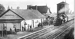 The town's name comes from an Irish-language epithet for Ireland, Inis Fáil, "Isle of Destiny".[6] Before this name was adopted, the town was often referred to as "Poplar Grove".[7] Sandy Fraser, Napoleon Remillard, Arthur Content and Bill Kemp settled in the area from 1884 to 1887. These were Innisfail's first settlers. Dr. Henry George was an important physician and coroner for Calgary and Central Alberta. He settled in Innisfail and built a house he called "Lindum Lodge" (this is where the Dr. George/Kemp house is today). Later the house was occupied by Bill Kemp and Kate Jane Kemp, who ran it as a boarding house until the 1960s.[8] More people continued to move to the Innisfail area. The construction of the railroad attracted more settlers and business. One of the first businessmen in the area was G. W. West. He is very important to Innisfail's past as he ran a general store, meat market, and grocery store. He was Innisfail's first proprietor when he moved here in 1891. By the 1900s, Innisfail was a village. Some of the early businesses included the Union Bank, the Murray Hotel, Hotel Alberta, the New York Café, the Modern Café, the Paris Café, the Opera House and the West Store.[9]