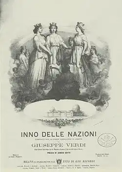 Roberta Montemorra Marvin (who edited Inno delle nazioni for The Complete Works of Giuseppe Verdi series) considers that the committee did not initially ask Verdi to compose a piece because of Chorley's antipathy toward the composer's works. Nevertheless, after Rossini's refusal, in 1861 the committee invited Verdi, offering four suggestions as to form: anthem, chorale, triumphal march (for full orchestra), or march (for wind instruments).[3] While honored by the request, Verdi tentatively declined, despite the intervention of fellow Italian and conductor Michael Costa, claiming his duties in preparing La forza del destino left no time available. He promised to consider the question in February 1862, once the preparation of the opera was out of the way.[3]