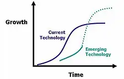 Innovative companies will typically be working on new innovations that will eventually replace older ones. Successive s-curves will come along to replace older ones and continue to drive growth upwards. In the figure above the first curve shows a current technology. The second shows an emerging technology that currently yields lower growth but will eventually overtake current technology and lead to even greater levels of growth. The length of life will depend on many factors.[79]
