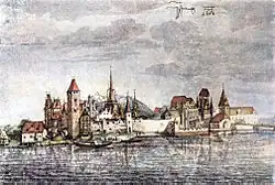 The first mention of Innsbruck dates back to the name Oeni Pontum or Oeni Pons which is Latin for bridge (pons) over the Inn (Oenus), which was an important crossing point over the Inn river. The Counts of Andechs acquired the town in 1180.[5] In 1248 the town passed into the hands of the Counts of Tyrol.[6] The city's arms show a bird's-eye view of the Inn bridge, a design used since 1267. The route over the Brenner Pass was then a major transport and communications link between the north and the south of Europe, and the easiest route across the Alps. It was part of the Via Imperii, a medieval imperial road under special protection of the king. The revenues generated by serving as a transit station on this route enabled the city to flourish.