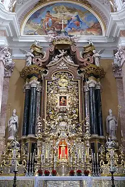 The imposing marble structure of the high altar contains the cathedral's most precious treasure, the painting Maria Hilf (Mary of Succor) by Lucas Cranach the Elder from c. 1530. Originally belonging to a gallery of paintings owned by the Electorate of Saxony in Dresden,[21] this unique image of the Madonna and Child is filled with "the dignity of the Queen of Heaven, the charm of the Virgin and the gentleness of the mother."[23] The painting, which typifies the Baroque veneration of the Virgin Mary, was a gift from John George I, Elector of Saxony to Archduke Leopold V, and has resided in the church since 1650. On workdays, it is framed by Joseph Schopf's 1789 painting of Saint James and Saint Alexius venerating the Virgin Mary. On feast days, the painting is surrounded by silver angels and golden rays.[22] Maria Hilf remains among the most venerated Marian images in Christendom.[4][22]