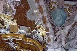 The pulpit by Innsbruck sculptor Nikolaus Moll[Note 2] is a Baroque masterpiece from 1725.[19] Gilded and silver-plated throughout, the pulpit is adorned by three divine virtues supporting the base, symbols of the four Evangelists, and a host of angels and cherubs on the sounding board. The base of the pulpit displays the Zech-Fieger coat of arms.[22] Moll also carved the magnificent organ front, which dominates the west end of the cathedral. Serving as a pendant to the high altar, the organ's richly gilded casing, with its rigorous carving work and top piece with figure decorations, is regarded as one of the loveliest Baroque organs in the Tyrol.[22] The organ front bears the coat of arms of its donor, Dr. Matthias Tausch.[13]