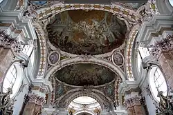 The cathedral interior receives its characteristic appearance from the frescos that decorate the vaulting, with their color fully realized by the abundant natural light from the clear windows.[18] The frescos were painted by Cosmas Damian Asam from Bavaria. Trained in Italy, Asam was the first south German artist to employ the technique of optical illusion to project endless space.[18] The cycle of four frescos he created for the cathedral celebrate the life of Saint James, son of Zebedee, the patron of the church. In the main dome, Saint James is presented as a heavenly general with flag in hand, leading the Spanish Christian army against the Moors.[18] The spandrels show the four evangelists, and the side arches feature angels with the attributes of Saint James.[18] In the transept dome, Saint James is shown pointing to a Marian altar, urging the faithful to venerate the Virgin. In the fresco above the nave, the saint is shown interceding on behalf of suffering humanity. In the dome above the organ, the saint is presented as the intercessor for Innsbruck, the Tyrol, Austria, and the Catholic Church. The small spandrel paintings associated with each fresco show allegorical figures that reference the main frescos.[18]