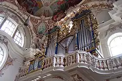 The stucco work by the artist's younger brother, Egid Quirin Asam, reflects the visual vocabulary of the Renaissance in both form and color, and supports the dominant presence of the paintings.[19] In concert with the harmony achieved between the frescos and stucco, and between the natural light and color, the design of the floors and walls plays a special supporting role. Consisting of an imaginative display of geometric patterns, the marble floors of the cathedral—considered among the finest in Austria—were designed by Christoforo and Theodoro Benedetti from the Trentino region.[19] They also designed the nine cathedral altars—all made entirely of multicolored Trentino and Veronese marble—as well as the pilasters in the nave, for which they chose Hague marble.[19] The side galleries above the presbytery, with their gilded Rococo ornamentation, were added during the time of Empress Maria Theresa.[20]