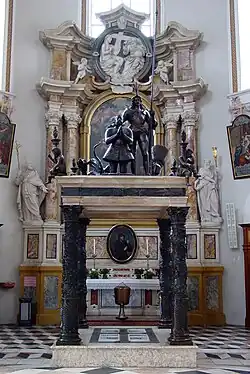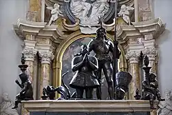 Acting as a type of ciborium, the canopy consists of four turned bronze columns, adorned with vine leaves, birds, and small animals. The columns, which have fluted bases and finely cut composite capitals, support a heavy profiled marble entablature, which serves as both an abacus and as a stand for the group of four bronze figures.[20] Dressed in armour, a bareheaded Archduke Maximilian kneels on a cushion with his hands folded in prayer. Saint George stands behind him—his hand resting on the archduke's shoulder. Behind the saint, the slain dragon slithers away. At the two front corners of the entablature are two mourning figures with torches. This group of precisely modelled, immaculately cast bronze figures "exemplify Austrian Mannerist sculpture of the highest quality."[20] The tomb also commemorates the last Grand Master of the Teutonic Order, Archduke Eugen, who was buried here in 1954.[20]