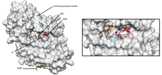 Inosine kinase belongs to the phosphofructokinase B (PfkB) family of sugar kinases.[1] Other members of this family (also known as the Ribokinase family) include ribokinase (RK) adenosine kinase (AK), fructokinase, and 1-phosphofructokinase.[1][2][3] The members of the PfkB/RK family are identified by the presence of three conserved sequence motifs.[1][2][4] The structures of several PfK family of proteins have been determined from a number of organisms and the enzymatic activity of this family of this family of protein shows a dependence on the presence of pentavalent ions.[5][1][4] Despite low sequence similarity between inosine kinase and other PfkB family of proteins, these proteins are quite similar at structural levels.[1] Other names in common use include inosine-guanosine kinase, and inosine kinase (phosphorylating). This enzyme participates in purine metabolism.