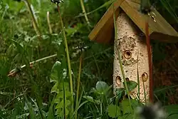 Insect hotels are generally thought to be a positive force in restoring or maintaining wild pollinator populations, especially native bees, many of which are endangered due to various factors such as competition with introduced bees like the western honey bee.[3] Insect hotels are especially thought to be a valuable resource for insects that have had their primary natural habitat destroyed. An example is Anthidium palliventre, which were common in the sand dunes of the San Francisco area – the species has struggled as the dunes have mostly been paved over for urban development.[4] Such insects are often forced to find alternative housing, such as in city parks, typically with less success. Over half of North America's native wild bees face similar difficulties, and the actual number is possibly greater due to insufficient data on certain species.[5] Bee hotels are sometimes constructed, whether by private actors, such as well-meaning homeowners and gardeners, or by government-led conservation projects, in attempts to remedy this issue and provide habitat to stabilize struggling native bee populations.[6]