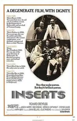 Inserts is a 1975 British comedy-drama film written and directed by John Byrum in his directorial debut, and starring Richard Dreyfuss, Jessica Harper, Bob Hoskins, and Veronica Cartwright.[6]