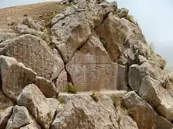 There is evidence that Inshushinak could form a triad with Napirisha and Kiririsha.[50] It originally formed no earlier than in the first half of the nineteenth century BCE, with references only starting to appear commonly in texts from the Middle Elamite period.[51] These three deities are invoked together in Untash-Napirisha's inscriptions from Chogha Zanbil and in texts attributed to Shilhak-Inshushinak.[52] It has been suggested that since Inshushinak was the lead god of Susa and Napirisha held an analogous position in Anshan, rulers might have sometimes attempted to present them the same figure.[53] For example, in a number of texts from Chogha Zanbil plural forms are not used when these two gods invoked at once where they would be necessary according to the grammar of the Elamite language.[54] It has been argued that the Kurangun relief, which depicts a male deity variously interpreted as either of them by modern authors, might have been a product of this process.[55] Milad Jahangirfar states that most likely both of them nonetheless maintained separate identities, though Inshushinak likely acquired some traits from Napirisha.[50]