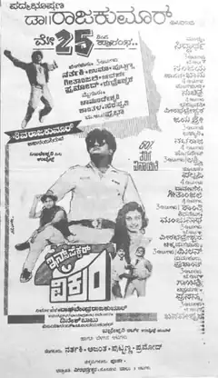 Inspector Vikram is a 1989 Indian Kannada-language comedy thriller film directed and filmed by Dinesh Baboo, written by Chi. Udaya Shankar and produced by Raghavendra Rajkumar under the banner of Nikhileshwari Cine Combines.The film stars Shiva Rajkumar in the title role with Kavya, Chi Guru Dutt, Aparna and K. S. Ashwath in other supporting roles.[1] It revolves around an undisciplined, but intelligent police inspector, Vikram. It is regarded as the first Kannada film of the comedy thriller genre and the first cop-comedy movie of Kannada cinema.[2]