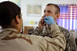 Insufflation (Latin: insufflare, lit. 'to blow into') is the act of blowing something (such as a gas, powder, or vapor) into a body cavity.[1] Insufflation has many medical uses, most notably as a route of administration for various drugs.