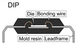 Cross section of a dual in-line package. This type of package houses a small semiconducting die, with microscopic wires attaching the die to the lead frames, allowing for electrical connections to be made to a PCB.