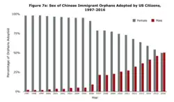 Generally, the US adopts more girls than boys. From 1999 to 2012, around 62% of adoptees by US families were girls, and only 38% were boys.[29] Yet this discrepancy between female and male adoptees has gradually declined. In other words, now the sex ratio of girls and boys adopted is more balanced.[30]