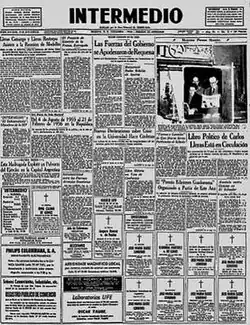 Intermedio (English: Interlude) was a Colombian newspaper issued as a replacement for El Tiempo, when it was closed down during the dictatorship of General Gustavo Rojas Pinilla, in the early morning of August 4, 1955. The night before, the newspaper building was occupied by government troops that prevented the publication of a new edition.[1] Intermedio was the first publication of the Casa Editorial El Tiempo, a publishing company founded by former President Eduardo Santos in order to use printing equipment to make different kind of printed products.[2]