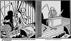 Intermedio used the same typeface in its masthead as used by El Tiempo, the layout was identical, and the sections and columns were the same ones that usually appeared in El Tiempo.[5] Even street sellers of newspapers kept announcing it as El Tiempo, although that was not its name.[9] What is more, the name of Intermedio was purposely chosen to mean that the situation was something temporary, short-lived, like the interlude of a theater play, and that the dictatorship of Rojas, sooner rather than later was going to fall.[10] To emphasize that idea, the front page of the first edition included a cartoon by Hernando Turriago "Chapete",[11] in which a very old actor standing on stage, with an hourglass and a scythe in his hands, greets the spectators by saying: "Thank you very much, ladies and gentlemen. And now, some moments of Interlude". However, in that first edition of twelve pages, Intermedio reluctantly had to publish a press release ordered by the regime in which ratified that the death of the Correas (what triggered the closure of El Tiempo), had been caused by an accident.[2]