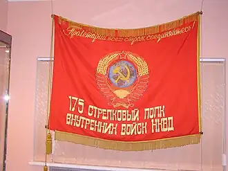 In the last months of the war and after the Victory in 1945-1950, units of the internal troops also operated outside the borders of the USSR, ensuring the security of the rear of the active army, order in populated areas in the months of the formation of military and civil authorities after the war, participating in combat operations against the nationalist and anti-Soviet underground.[24] On March 15, 1946, the NKVD was split into two organizations: Ministry of Internal Affairs and the Ministry of State Security. On January 21, 1947, the internal troops of the MVD (operational units) were reassigned to the Ministry of State Security. The escort troops remained part of the MVD of the USSR.[25] On July 10, 1949, the escort units were assigned to escort prisoners to judicial institutions, to exchange points on scheduled railway routes in republican, regional and provincial centers. On May 6, 1951, by the resolution of the Council of Ministers of the Soviet Union, the escort guard was assigned the task of transporting prisoners and defendants by scheduled (special) convoys along railway and waterways, as well as moving them from prisons to camps and colonies; also, at the request of the Prosecutor's Office and law enforcement agencies, they were assigned the task of escorting them to court hearings of the Supreme, regional, provincial courts, military tribunals, and liner courts by rail and water transport; escorting them to train cars at exchange points.