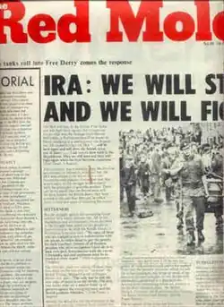 The IMG strongly supported the IRA, adopting the slogan "Victory for the IRA".[8] After the events of Bloody Sunday John Lennon and Yoko Ono attended a protest in London while displaying a Red Mole newspaper with the headline "For the IRA, Against British Imperialism".[9]
