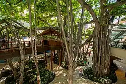 A large banyan tree saw Beach's installation of an office tree house where he could be seen surveying the activity in the Market Place below. Other buildings included the Dagger Bar, and several representations of small villages meant to symbolize Korea, China, Japan, and the South Seas. During the 1960s, the Market Place also included the Hawaiian Hālau, Japanese Tea House and Esplanade buildings. Generations of notable musicians performed at the Market Place’s nightclubs. This included Martin Denny, the bandleader behind the fusion of new wave jazz and jungle noises called exotica. Singer Don Ho later had a regular gig at the International Market Place before he hit it big at places like Duke Kahanamoku's Nightclub.[5][6][7] At its height the International Market Place encompassed 50 shops, night clubs, and restaurants, three of which were owned by Beach himself, including The Colonel's Plantation and Beef Steak and Coffee House.[8]