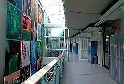 The 19-acre campus includes three libraries/media centers, a 400-seat theater, three cafeterias, seven science labs, a design technology center, outdoor learning centers, dance and music rooms, two gyms, functional fitness center and sports fields.[3]