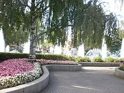 One of the first sights seen on entering the park is a large flowerbed representing the Canadian flag. The bed is empty during the park's first weeks of being open and is replaced with a faux graveyard during the autumn for Halloween Haunt. Approximately 11,000 begonias are planted in the bed, which is 80 feet (24 m) by 50 feet (15 m) in size.[3] Behind it is a large fountain area, with a variety of water patterns all day and lighting effects at night. A pathway structure, modeled to look like an arch bridge, contained (as of 1982) a computer that controlled the fountain's 93 pneumatic valves and nozzles and its 504 red, white, and turquoise lights.[2] In 1982, the lighting patterns would change roughly every 30 seconds, with a 30-minute rotation.[2] In 2011, the lights were upgraded to offer a range of 16 million colours.[4] Before the park opened, the 300-foot (91 m) by 80-foot (24 m) water basin was referred to as Royal Fountain.[5]