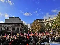Ethnic Armenian populations around the world have lobbied for peace negotiations.[125] On 1 October, the South Ossetian Armenian community condemned Azerbaijan and Turkey, urging recognition of Artsakh's independence.[126] The next day, Armenians in Samtskhe–Javakheti, in Georgia, expressed concern and their intention to send aid.[127] Subsequently, Georgia closed its border with Armenia, indicating frustration within Georgia's Armenian minority.[128] Croatia's Armenian diaspora's leader asked for support against what she described as a genocide against the Armenians.[129] On 5 October, Armenian Americans protested outside the Los Angeles (LA) CNN building, calling for more accurate coverage.[130] On 11 October, the LA community held a 100,000-person strong protest march to the Turkish Consulate, in tandem with smaller protests in Washington, San Francisco, New York City, Boston and elsewhere in the United States.[131][132] LA's mayor expressed support for Armenia and the city's Armenian community by lighting up City Hall with the Armenian flag's colours.[133][134] A protest was held in Orange Country during President Trump's pre-election rally calling on him to sanction Turkey and Azerbaijan; Trump praised them by saying, "the people from Armenia have great spirit for their country".[135][136] Protests have occurred all over Europe demanding recognition of Artsakh's independence, with the largest rallies held in Paris, France, and in front the Council of the European Union in Brussels, Belgium.[137] A major rally was held in Aleppo, Syria by Armenians and Syrians condemning Azerbaijan and Turkey.[138] Armenian communities have also protested globally, notably in Argentina,[139] Australia,[140] Canada,[141] and Uruguay.[142]
