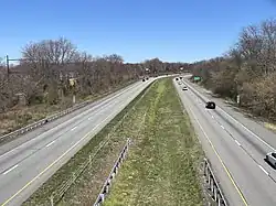I-295 crosses the Crosswicks Creek into Hamilton in Mercer County and runs through woods and marshland a short distance east of the Delaware River. A scenic overlook of the river is located along the southbound side of the road; access from the northbound lanes is provided by a pedestrian bridge over the highway. The freeway heads farther from the river and passes over the River Line again before it reaches a modified cloverleaf interchange serving the western terminus of I-195 and the southern terminus of Route 29 to Trenton. Following this junction, the road heads northeast near residential neighborhoods and comes to an interchange at Arena Drive (CR 620) that provides access to nearby White Horse Avenue (CR 533). A short distance later, a southbound exit and northbound entrance provides access to northbound Olden Avenue (CR 622). I-295 continues through wooded areas with nearby development and curves north to come to an interchange at Route 33 and Hamilton Avenue (CR 606). The next interchange is a southbound exit and northbound entrance at East State Street (CR 535). The highway continues through woods and reaches a cloverleaf interchange serving Sloan Avenue (CR 649). The roadway comes to a bridge over Amtrak's Northeast Corridor railroad line and crosses into Lawrence Township, where it curves northwest and comes to a modified cloverleaf interchange with US 1.[2][8]