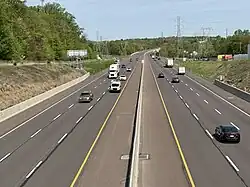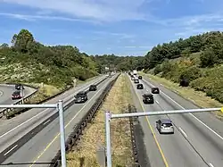 In 2007, the turnpike commission announced plans to widen the Northeast Extension to six lanes between Mid-County and Lansdale.[96] The project divided this stretch of highway into two sections. Work on the southern section began in January 2008 with the replacement of two bridges over the Northeast Extension to accommodate the widened highway. Construction on the actual widening phase commenced in January 2011. Completion was originally planned in 2013; however, construction fell a year behind schedule.[97][98] Construction on widening the northern section started in May 2014, while work on widening the southern section finished up in October of that year. By this point, the project scope was expanded to include the Lansdale interchange itself, the roadway to a point one mile (1.6 km) north of the interchange, and two new E-ZPass-only ramps at the Lansdale interchange to relieve congestion at the toll plaza. This new northbound exit ramp opened December 4, 2016, and the companion southbound onramp opened a week later.[99] Construction along the northern section was originally planned to finish by the end of 2016 but was delayed until mid-2017.[100] Construction was substantially completed, with all six lanes open, by August 31, 2017.[101]