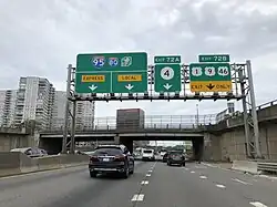 In Ridgefield Park, I-95 continues north as a toll-free highway cosigned with the New Jersey Turnpike and maintained by the NJTA.[2][9] This section of the Turnpike from this point to the George Washington Bridge approach is designated the “I-95 Extension” of the Turnpike.[10] It has a large interchange serving US 46, part of which was the original northern terminus of the turnpike before it was extended.[2] From this point, it has the appearance of a local–express lane configuration carrying three local lanes and two express lanes (3–2–2–3) in each direction, but the northbound "express" lane only leads exclusively to I-80 west while the northbound local lanes continues as the main trunk of I-95. (On the southbound side, the "express" lanes function as the main trunk of I-95 south while the southbound local lanes lead exclusively from I-80 east.) The road runs near suburban neighborhoods before entering Teaneck and intersecting with the eastern terminus of I-80. From here, I-95 turns northeast and splits into an actual local–express lane configuration with a 3–2–2–3 lane count, soon interchanging with CR 56 as it passes northwest of Overpeck County Park. The highway turns east as it skirts the border between Englewood to the north and Leonia to the south. After crossing CSX Transportation's Northern Branch, the highway enters inhabited areas as it passes over Route 93/CR 501 (Grand Avenue) and has a northbound exit and southbound entrance serving Broad Avenue.[2][5] I-95 forms a hairpin turn around Leonia to the southeast into Fort Lee and heads due south to Route 4. I-95 runs under the Edgewood Road Bridge here, an overpass that runs high above the highway, and is considered an iconic view for drivers entering New Jersey from the George Washington Bridge. After the overpass, I-95 runs in between the travel lanes of Route 4 as the freeway comes to a large interchange with southbound exits and northbound entrances for Route 4, US 1/9, US 46, and a full interchange with the southern terminus of US 9W (Fletcher Avenue). At this location, the New Jersey Turnpike officially ends and the jurisdiction changes from the NJTA to the PANYNJ.[2]