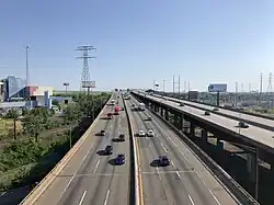 At this point, I-95 continues northeast on the mainline of the New Jersey Turnpike, with 12 lanes featuring six inner lanes exclusively for cars separated from six outer lanes for cars, trucks, and buses.[2][7] It soon reaches an exit for US 206 in Bordentown Township. Continuing north through mostly rural areas, the road heads into Mercer County and comes to the I-195 interchange in Robbinsville Township. In East Windsor, I-95 reaches the exit for Route 133/Route 33, located to the east of Hightstown.[2][5] Heading into Middlesex County, development near the highway increases.[5][8] At this point, an interchange serves Route 32 in Monroe Township.[2] Continuing north into more dense suburban development, I-95 intersects Route 18 in East Brunswick near the city of New Brunswick.[2][5] After crossing the Raritan River, the New Jersey Turnpike heads northeast to the I-287/Route 440 junction in Edison. In Woodbridge Township, the highway comes to a large interchange accessing both the Garden State Parkway and US 9.[2] From this point, the road enters areas of heavy industry and comes to the County Route 602 (CR 602) exit in Carteret. In Union County, I-95 comes to the I-278 exit on the border of Linden and Elizabeth at the western approach to the Goethals Bridge. In the northern part of Elizabeth, the New Jersey Turnpike comes to Route 81 which provides access to Newark Liberty International Airport before the road runs to the east of the airport. After the airport, I-95 intersects I-78 in Newark, Essex County.[2][5] At US 1/9 Truck, the New Jersey Turnpike splits into two alignments and enters the New Jersey Meadowlands.[2][4][5]