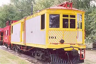 Many interurbans did substantial freight business. In 1926, the Cincinnati, Hamilton and Dayton Railway moved 57,000 short tons (50,893 long tons; 51,710 t) of freight per month. By 1929, this had risen to 83,000 short tons (74,107 long tons; 75,296 t) per month.[60] During the 1920s freight revenue helped offset the loss of passenger business to automobiles.[61] A typical interurban freight train consisted of a powered box motor pulling one to four freight cars. These often operated at night as local ordinances forbade daytime freight operation on city streets.[62] Interurban freight in the Midwest was so extensive that Indianapolis constructed a very large freight handling warehouse which all of Indianapolis' seven interurbans companies used.[63]