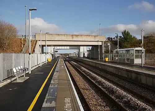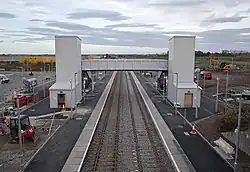 The final plan for the station included two platforms, a 64 space car park with 10 electric bays, four disabled bays, cycle paths, and two lifts. A passing loop was also included. Two buses an hour connect the station with the airport. The level crossing crossing at Petty was also closed.[12]