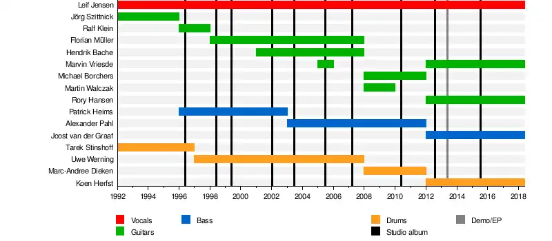 Vocalist Leif Jensen entered the band in 1992, drummer Uwe Werning 1997 and guitarist Hendrik Bache in autumn 2001.