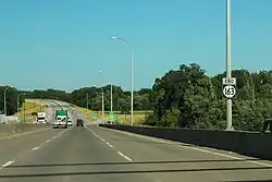 Iowa Highway 163 begins at the corner of E. 14th Street, which carries U.S. Highway 69 (US 69), and E. University Avenue in Des Moines. It heads east along E. University traveling 3⁄4 mile (1.2 km) to Interstate 235 (I-235).[1] There is no direct access to eastbound I-235 from eastbound Iowa 163. Traffic must take E. 21st Street to Easton Boulevard to access eastbound I-235. Highway 163 continues east past the Iowa State Fairgrounds on its way to Pleasant Hill where it meets U.S. Highway 65 at a diamond interchange.